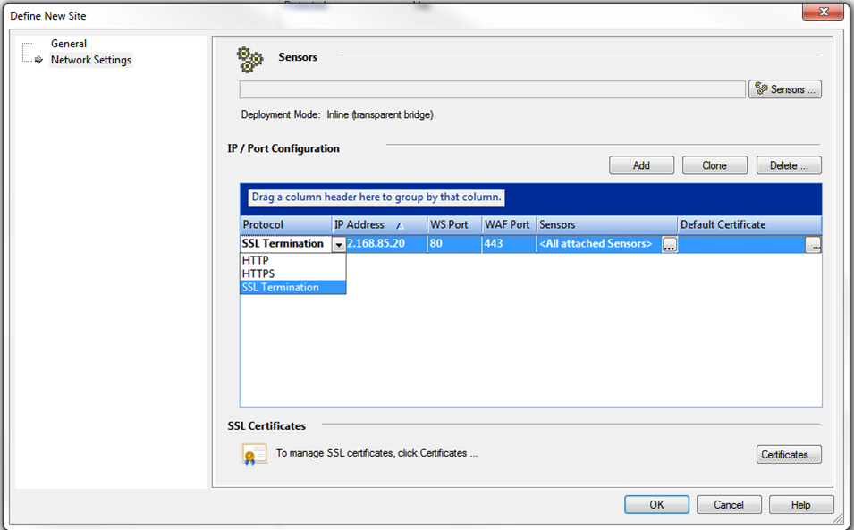 • In the WAF console you will find a new protocol available when configuring network settings: SSL Termination