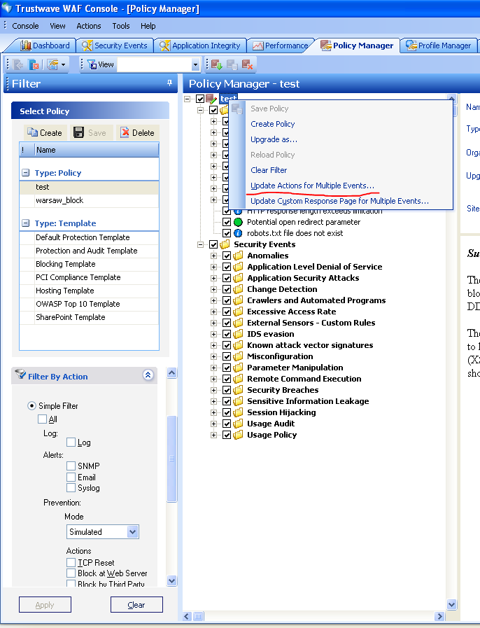 5. Right click the policy name and select "Update Actions for Multiple Events"