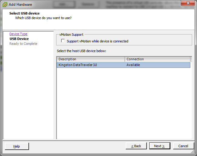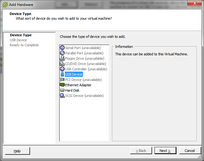 5. Add a USB Device as shown in the following screenshots. The name of the device will depend on the physical device you have attached.
