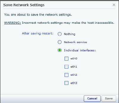 5. Select an Individual interfaces restart option, and then select the interface related to the IP address you just changed and click Save. Alternatively you can restart the Network Service by clicking Network Service and clicking Save).
