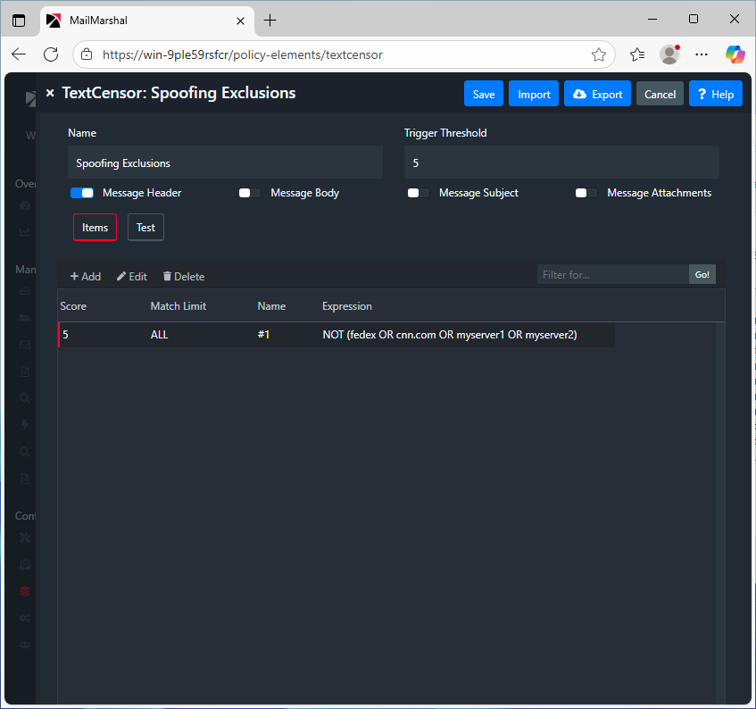 • The expression specified in the image above will exclude messages with fedex, cnn.com, mysever1 or myserver2 in the message headers: