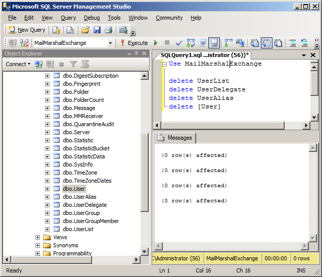 - LevelBlue recommends that you use the SQL Server Management Studio tool to enter the query that performs these actions, as shown in the screenshot below. The "rows affected" will change depending on the user registrations on your system.