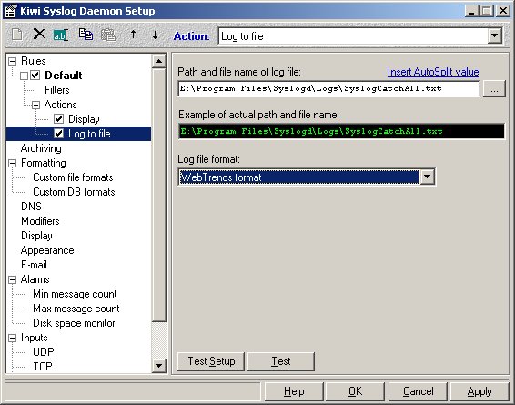To analyze Kiwi syslog log files successfully, you must configure Kiwi to log in "WebTrends format". To do this please follow the instructions below: