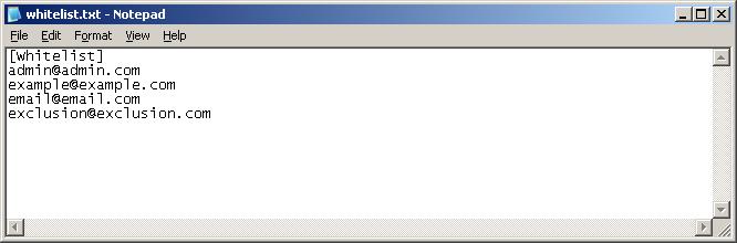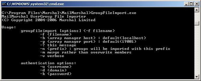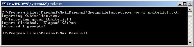 - To input the email addresses without deleting any details already contained within the target User Group, use the following syntax: GroupFileImport.exe -m -f whitelist.txt