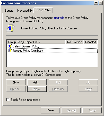 3. Right click on the domain and select Properties. Select the Group Policy tab.