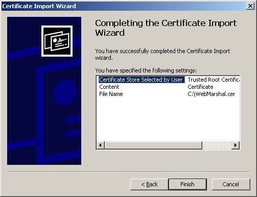 8. Follow the prompts and select the Security Certificate you have exported from the HTTPS Content Inspection window on the Server and Array Properties dialogue window in WebMarshal - Tools > Server and Array Properties. See User Guide and Help for more information.