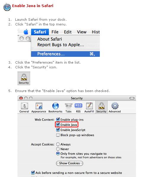 If using browsers IE, Firefox or Safari for Vista, XP, or Macintosh you must enable Java.