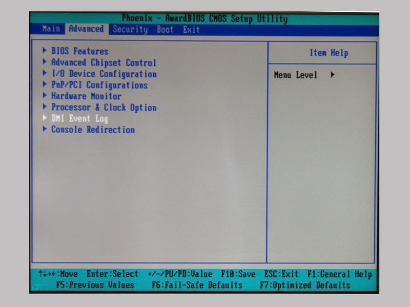 2) Using the arrow keys, move over to the right to highlight 'advanced' menu and press enter.  See attached photo 'advanced_menu' for an example of this menu.