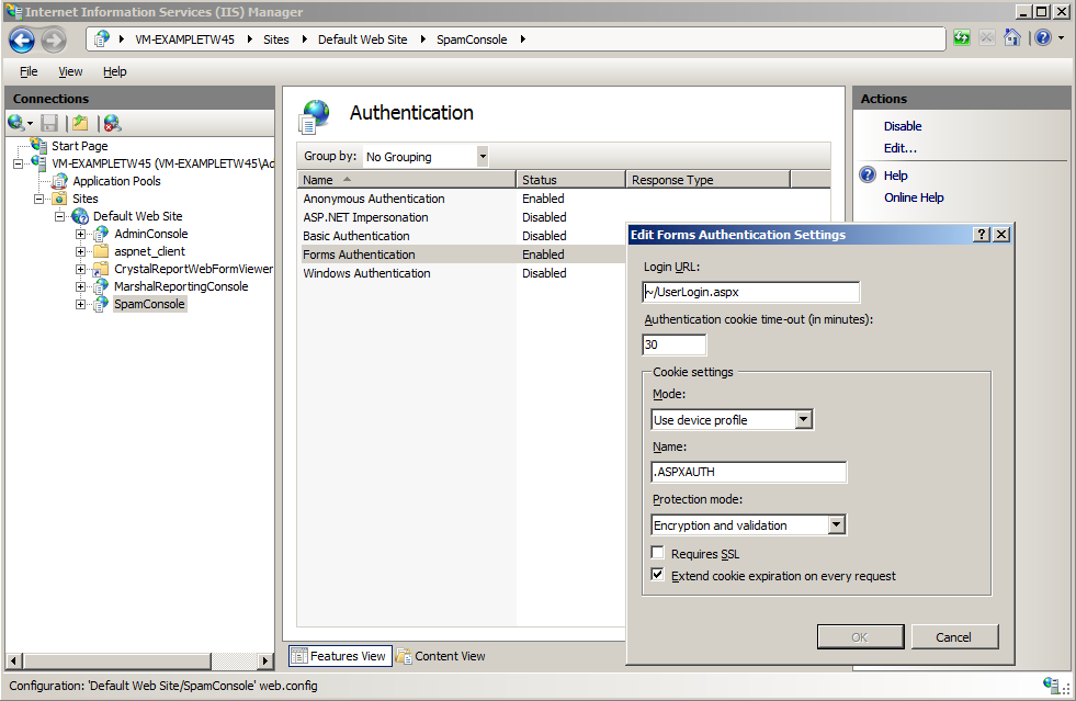 - On the Authentication page, select Forms Authentication and then click Edit (from the right pane Actions list).