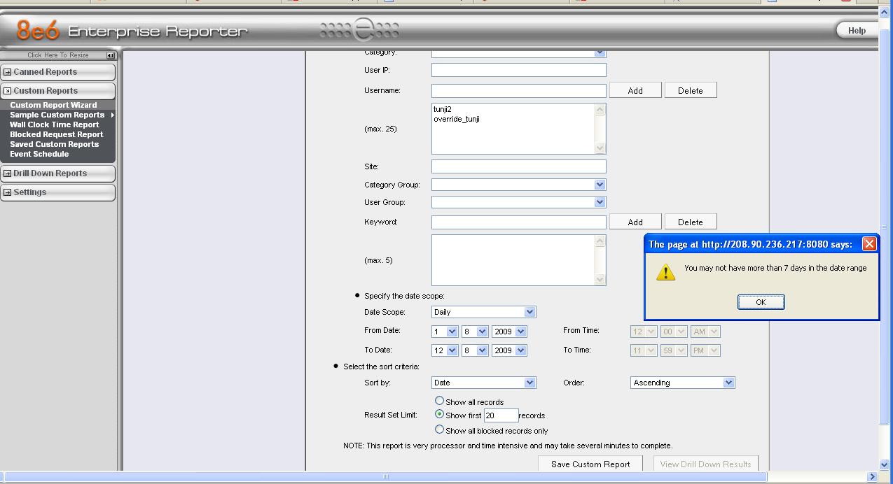 - When I try to run a custom report based on multiple usernames entered in the Custom Report Wizard->Specific user detail by page, I get a pop up that says "You may not have more than 7 days in date range", how may I change the number of days?