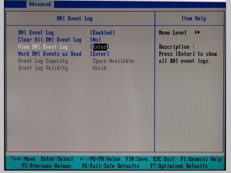 3) Using the arrow keys, move down to the 'DMI event log item', and press enter. See attached photo 'view_log' for an example of this menu.