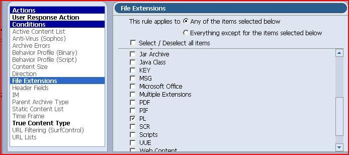3. In the File Extension condition, select PL extension. This ensures that the rule will be enforced only if the file has a Perl script content type and also .PL extension. Please see the picture below.