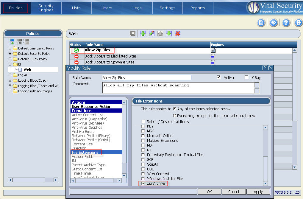 An "Allow" rule of archive files (by file extension or true content type for example) does not white list an archive file and the rest of the policy's rules below it will be implemented on this archive file.