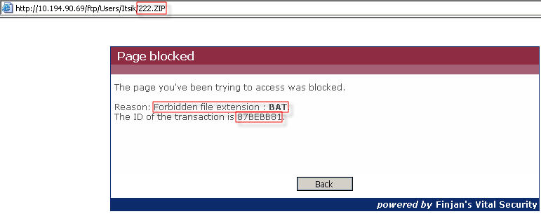 Try to browse to an archive file containing executable files inside it - the file will be blocked.