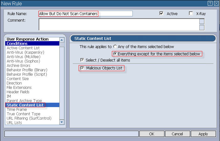 A.   In the "Static Content List" field check on the "Malicious Objects List".