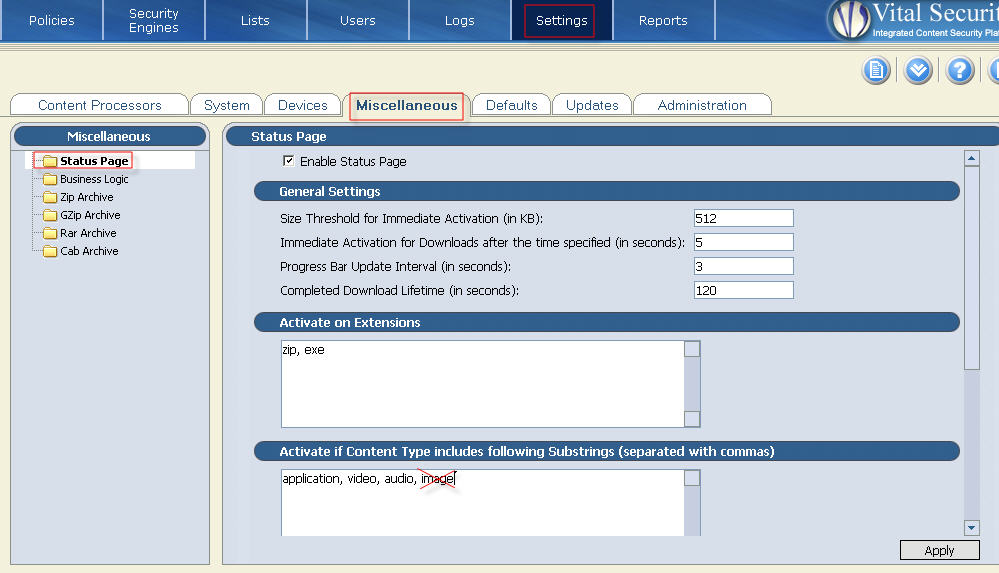 The solution is either to disable the status page feature for this specific multimedia type or to increase the threshold size. The first option of disabling the status page only means that the status page with the scanning bar will not be displayed; the files will be scanned reagrdless.