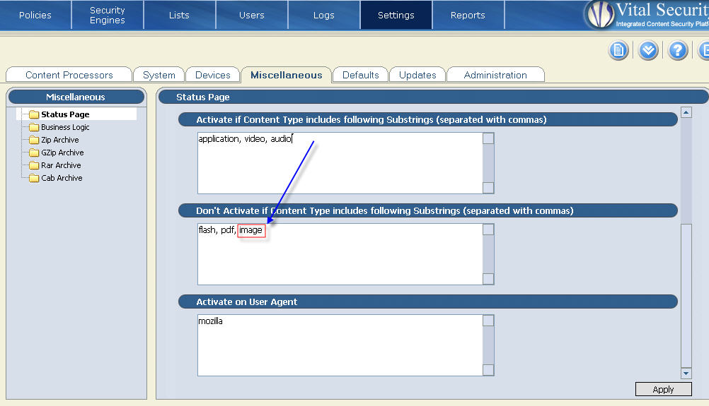 - Under “Activate if Content Type includes following Substrings (separated with commas)” delete the string image.