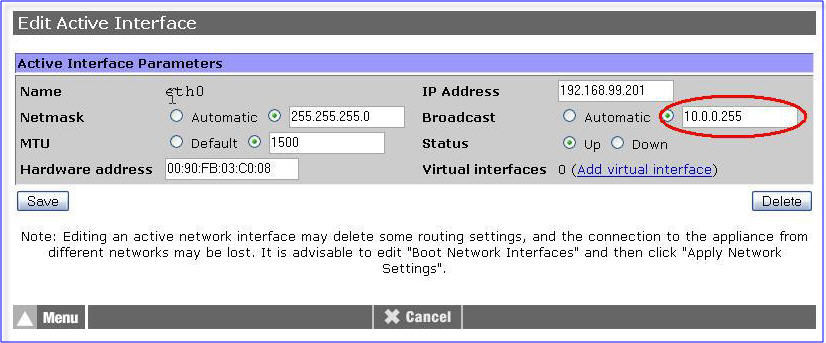 After running the first install wizard (https://10.0.5.1:3012) you can choose to set the primary interface to a different address. Even though this is set correctly, the broadcast address remains unchanged when it should have been set to "automatic".