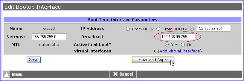 Set the broadcast address for the configured interface to "automatic" and apply the changes and network settings.