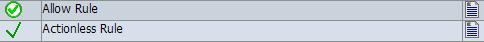 Below is a screenshot the illustrates the difference between the Status icons for an actionless rule and an Allow rule. The Allow rule's icon is a green checkmark inside a green circle. The actionless rule's icon is simply a large green checkmark without a circle. Both rules in the screenshot are associated with a URL List condition.
