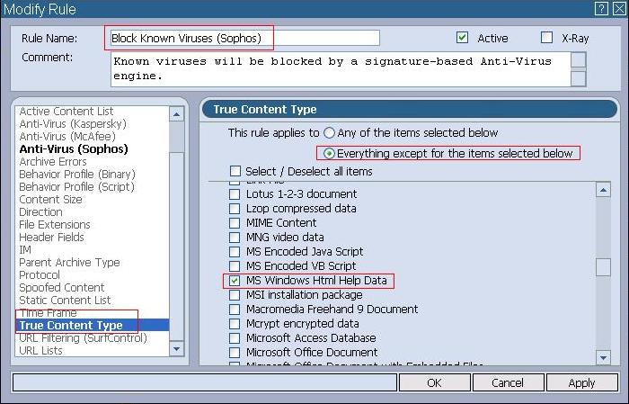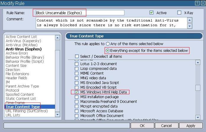 As a workaround solution, to disable scanning CHM files with Sophos we recommend to modify the set of policy rules that use the Sophos engine with an additional condition: True Content Type is not equal to CHM.