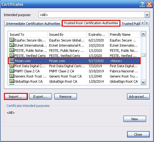 The Finjan signed certificate that needs to be imported to the browser is attached to this article (finjan.pem).