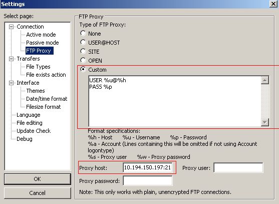 2) Set Type of FTP Proxy to Custom and type: