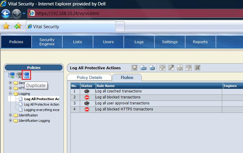 2. Highlight the default, Log All Protective Actions, logging policy and click Duplicate button on the top as shown below:
