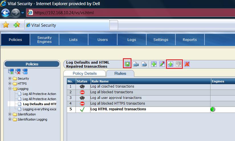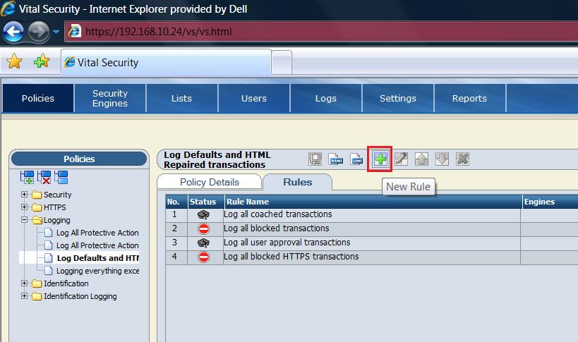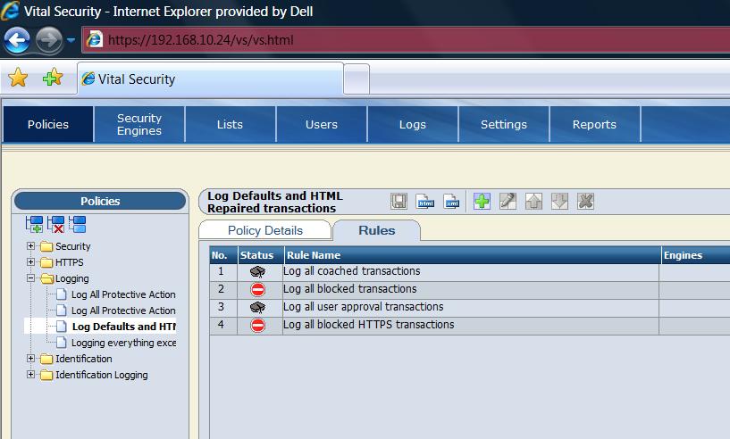 1. Browse to the Policies section of the management console of Finjan VSOS 8.5.0 and expand the logging policies node.