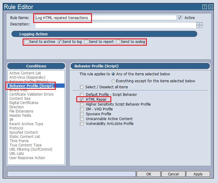 (Set send to archive/log/report/syslog options according to your preferrences)