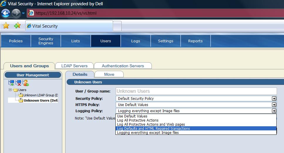 7. Browse to the Users section and set this logging policy for specific user(s) or group(s):