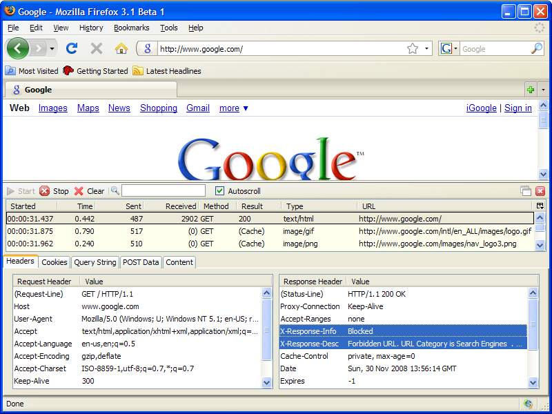 When you check the first HTTP Request (and any other request after that) you’ll see two HTTP headers, which come from the Finjan Scanner.