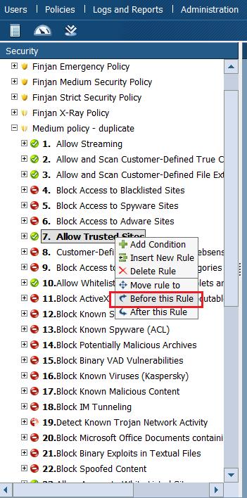 1. Log in to the GUI interface for the Finjan policy server