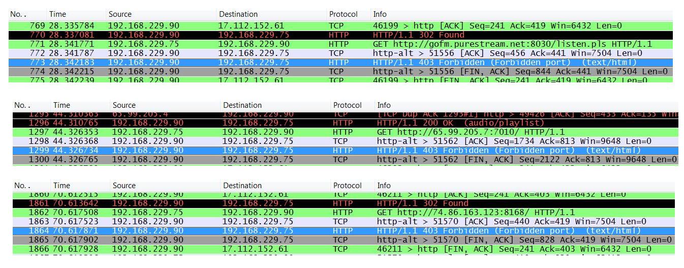 The extracts below from the network trace show that radio stations stream content on ports that are different from the standard HTTP port 80: