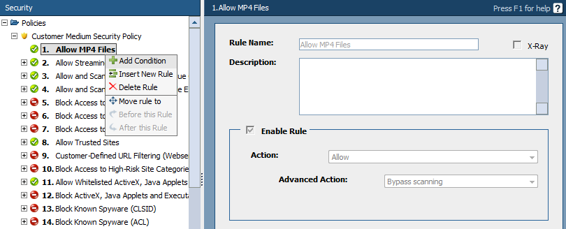 - Navigate to the security policy (Policies -> Security -> Advanced) that will be configured to allow MP4 files. Please note that this must be a custom security policy, since the built-in security policies are not editable. It is possible to duplicate a built-in security policy and use it as the basis for a custom security policy by right-clicking the policy to be duplicated and choosing the Duplicate Policy option.