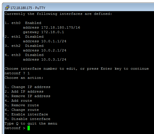 3. To change the eth0 interface, choose 1 from the menu and then choose the 1. Change IP address option: