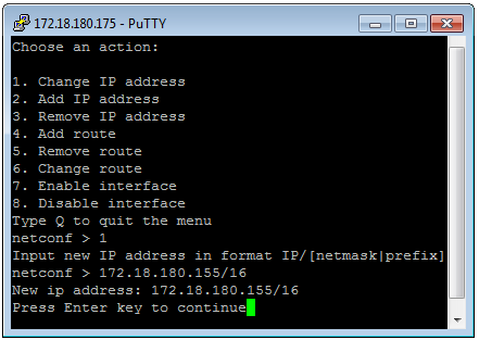 4. Type the new IP address including the netmask in CIDR format (slash notation), and press Enter to continue: