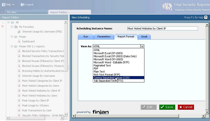 VSR 2.0 allows saving generated reports in various formats, including CSV. The CSV output format is available in VSR 2.1, but this parameter is now specified via the report scheduling options. Bellow are the steps for saving a report in CSV format.
