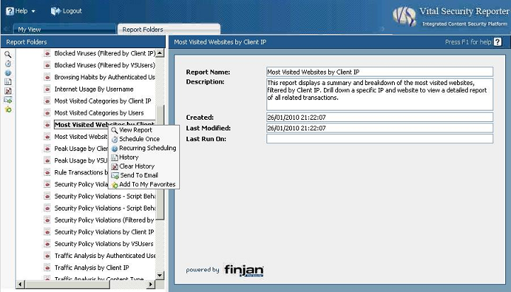 - Right-click the report that you wish to run (for this example, "Most Visited Websites by Client IP" was selected) and choose the Schedule Once option: