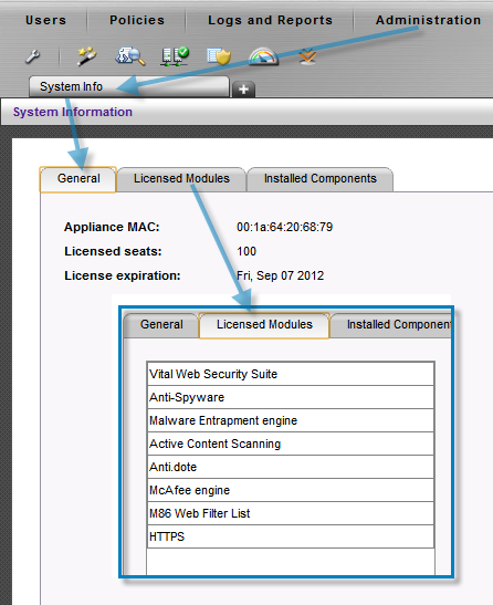 In order to check which components are licensed on the specific appliance click on Administration -->System Info