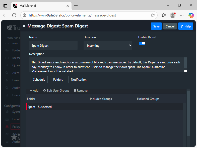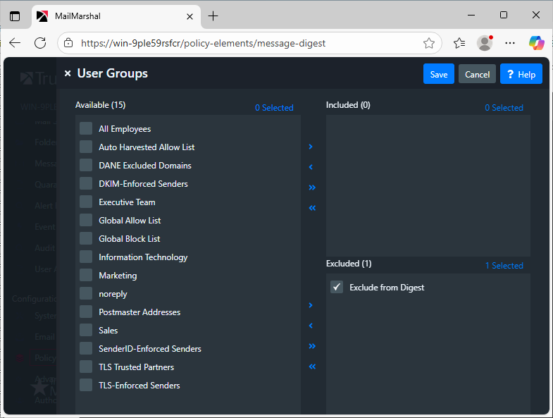 - In User Groups, create a new MailMarshal User Group with a descriptive name such as Exclude from Digest.