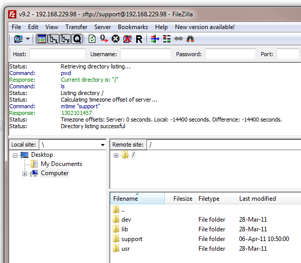 5. Now it is necessary to retrieve the trace file(s) from SWG for further review.  This is done using SFTP (a method for transferring files via SSH).  The screenshots below depict using FileZilla (a free SFTP client for Windows) for this purpose.