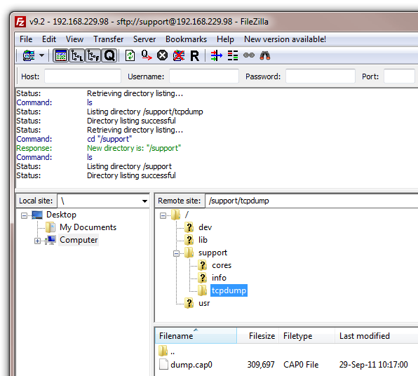 6. Navigate to the /support/tcpdump/ directory to copy the trace file(s) to your local file system: