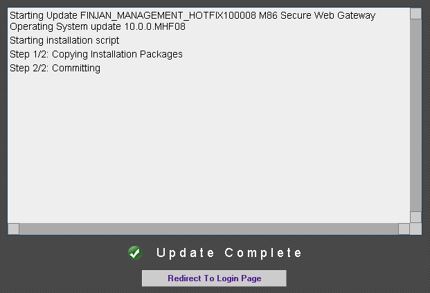 Wait for the install to finish then click “Redirect to Login Page”.  The installation should be complete and the update/patch is now installed.