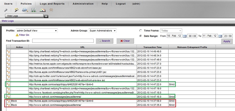 Note that if the Logging Policy is set to log more than Blocked/Corrective actions (e.g. "Log everything except images"), then the logs will show MEP levels for traffic that was not blocked, indicating that the Entrapper engine was called but allowed the traffic, as shown in green below:
