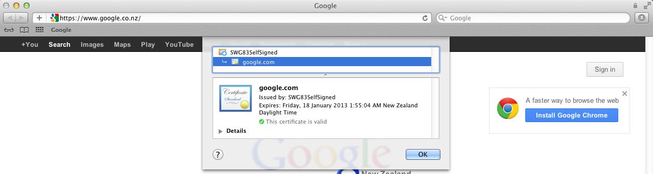 Next browse to a secure website with Safari and verify the SSL certificate details. In the example screenshot below, we browsed to https://www.google.com and the SSL cert from SWG is now trusted and valid in Safari.