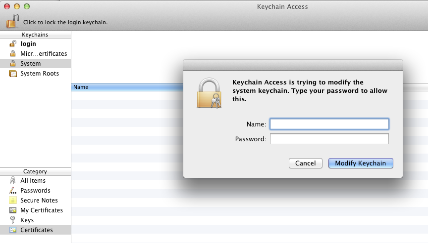 The Keychain Access app will start and prompt you to authenticate. Enter the administrator username and password.