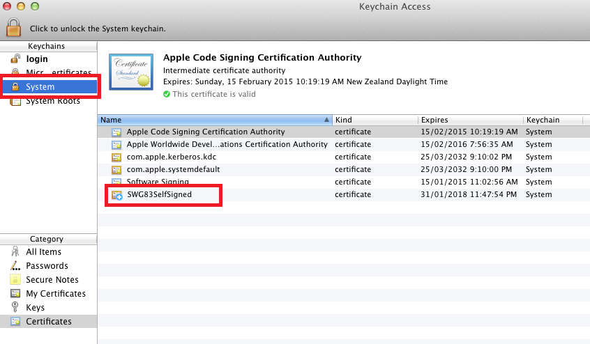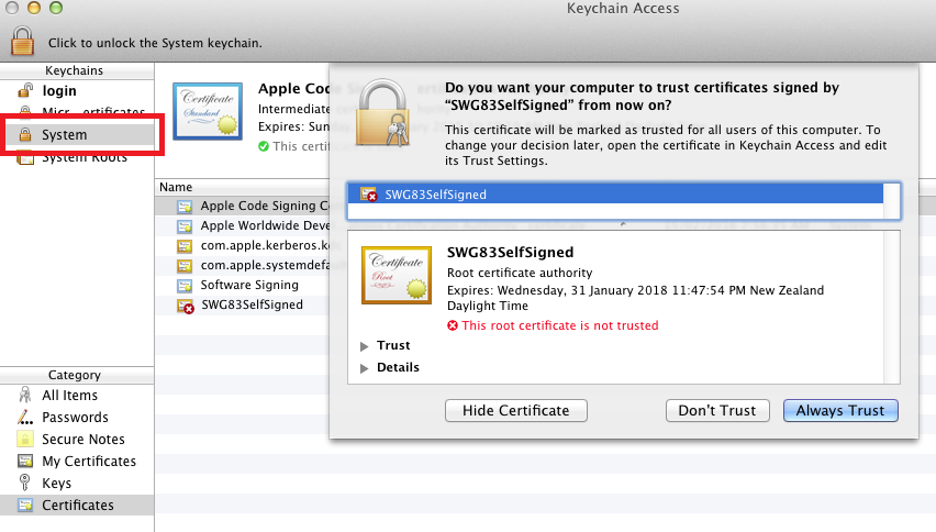 The Keychain Access app will next prompt you if you want to trust the certificate. Ensure that the System Keychain is selected on the left pane and select Always Trust. (Note the SWG certificate name will differ according to your installation, SWG83SelfSigned is just an example).