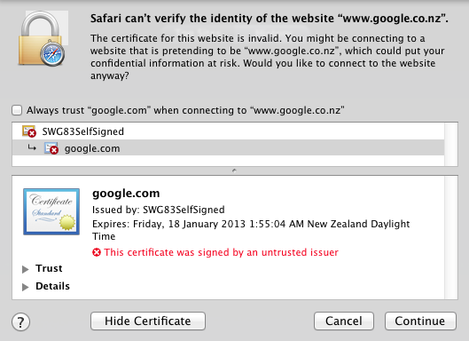 • When browsing to a secure website via SWG on a Mac OSX Safari browser, it may present a warning that it can't verify the identity of the website and that the certificate for the website is invalid.