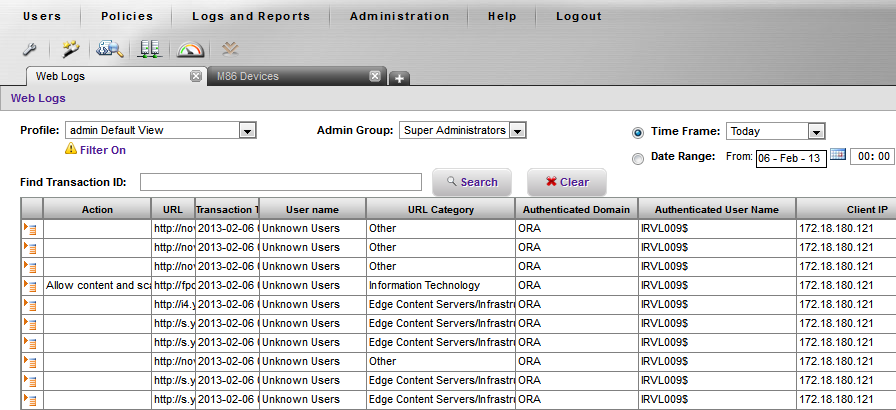 This can be verified in the Web Logs view showing Authenticated User Names containing '$' signs: